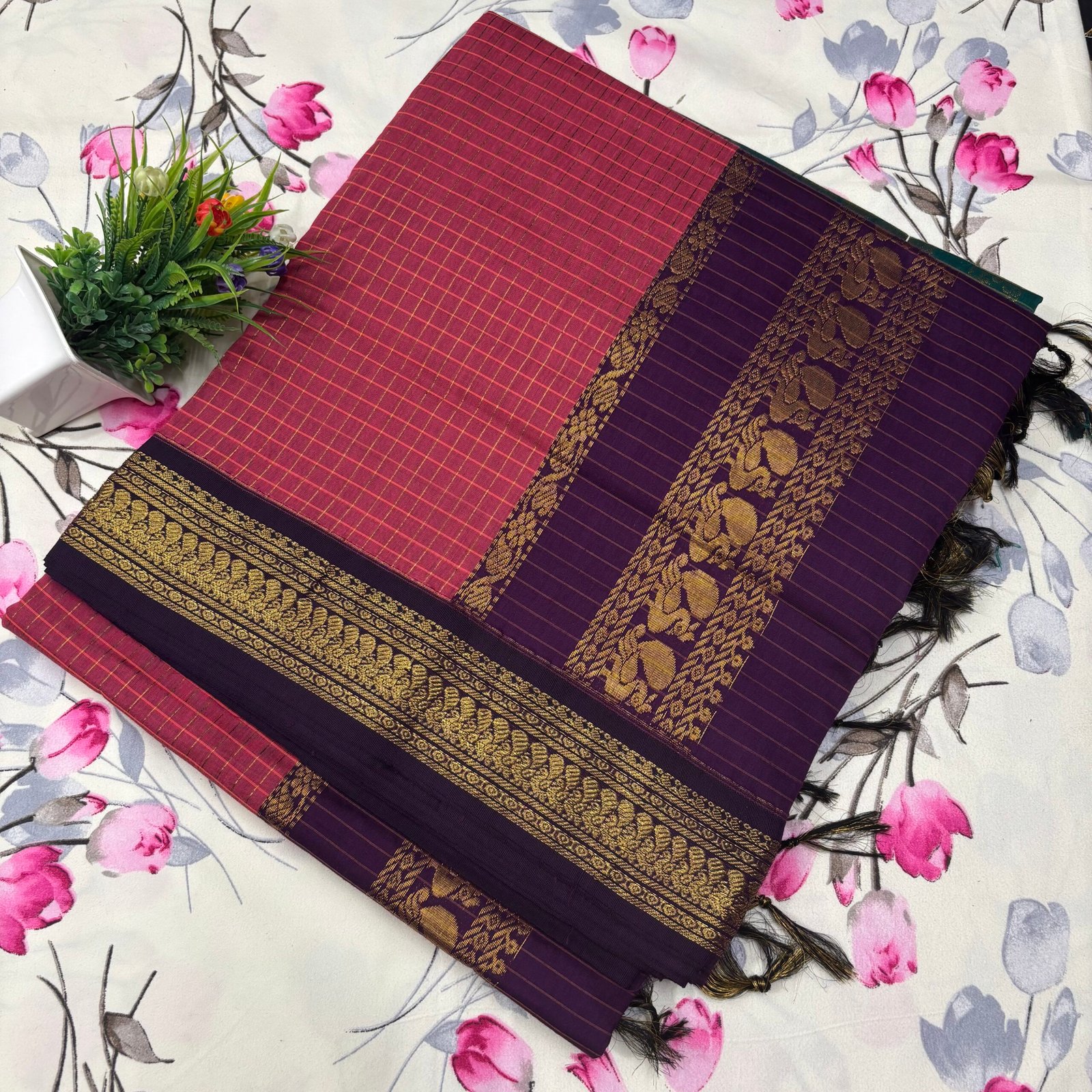 Checked Kalyani cotton – Rani pink with Purple