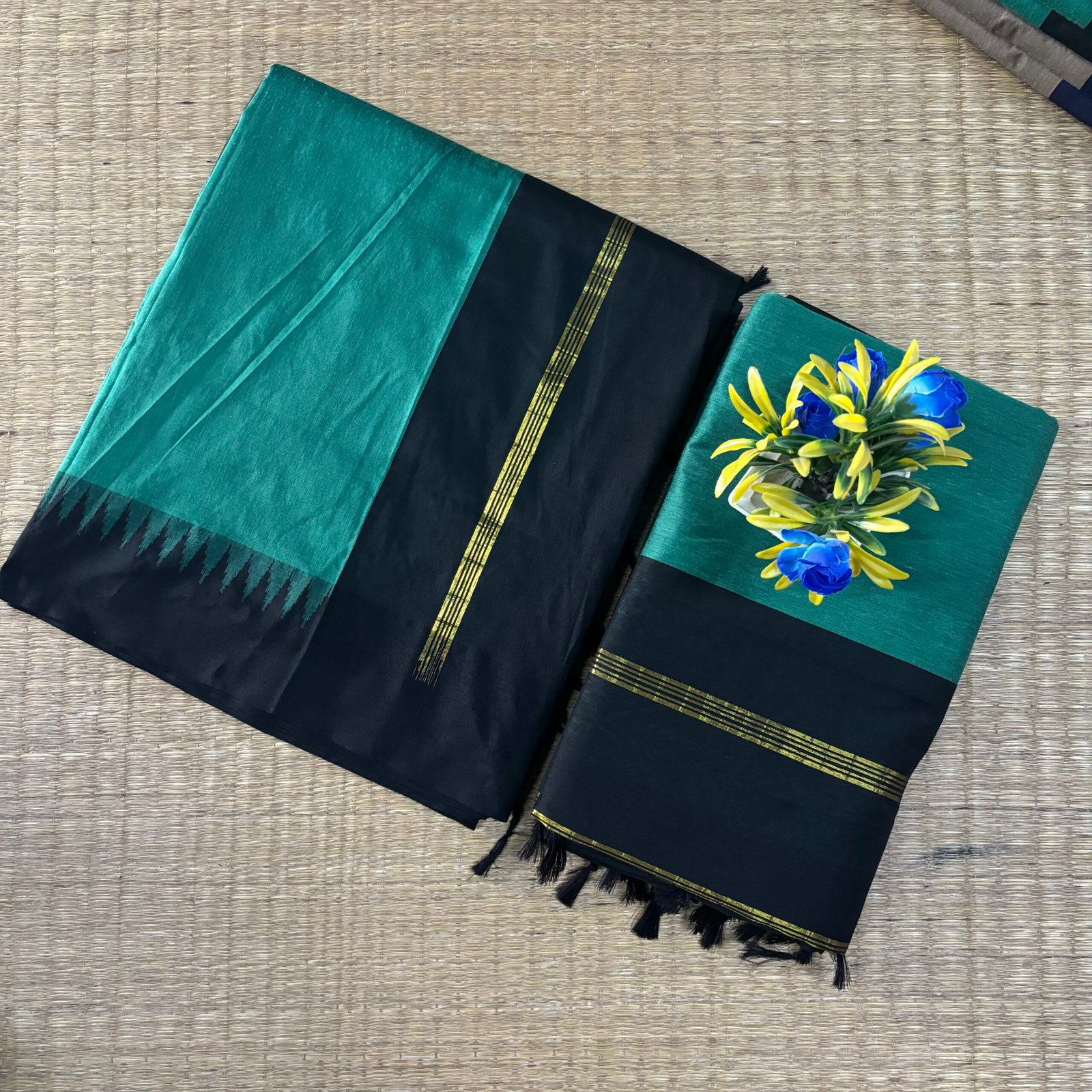 Elevate your everyday elegance with this washable pure cotton saree featuring a classic temple border and an attached blouse piece.